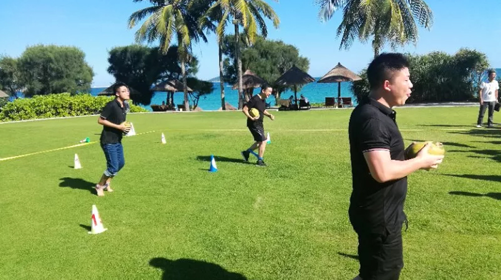 以往每年公司都会组织户外拓展活动,但这一次的户外拓展与以往不同的是拓展环境不再是以山为特色,而是以海、以沙滩为特色展开活动。在碧海蓝天、海风轻拂的沙滩上,拓展活动融入了海南的特色。第一项团队破冰,所有人员分成了4个团队,分别以海南特色水果作队名。有椰子队、芒果队、榴莲队、香蕉队。这几种水果在热带海南不仅常见,还很好吃。分队完毕,教练开始组织大家参加各个环节的拓展。每个拓展环节大部分以椰子作为道具,有椰子保龄球,挑战椰子障碍接力,水果猜猜猜以及海边最具特色的团队沙雕。