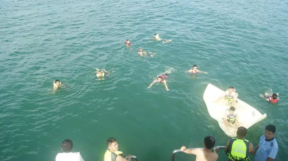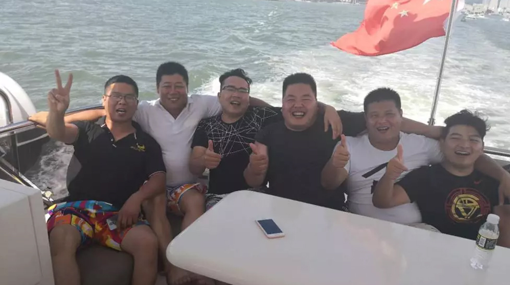 鉴于游艇容纳人数有限,我们60多人被分成两艘游艇出海。游艇有三层,内部设有环绕的沙发,中间茶几上摆放着红酒与水果。另外还有KTV房,休息室。游艇开始驶向大海,大约行驶了半小时左右,在不断的巨浪摇摆中抵达海中央。船长选了一处波浪较小的地方抛锚停船。停下后的游艇不再摇晃厉害,走出游艇抬头遥望远方,此刻,海风吹过耳畔,一丝丝温柔拂面,就像是和大海来一场最亲密的接吻。回头一看,船长已经开始分发救生衣了。原来小伙伴们已经蠢蠢欲动的要下海游泳了,当然还有部分的旱鸭子则拿着鱼竿到船头垂钓去了。到中途的时候,张总约了两辆摩托艇,让大家感受下骑着摩托艇在水面上飞驰的刺激。虽然每人只有几分钟的体验,但摩托艇的刺激让所有人无不赞叹、留恋。伴着傍晚的落日,我们才开始折返。
