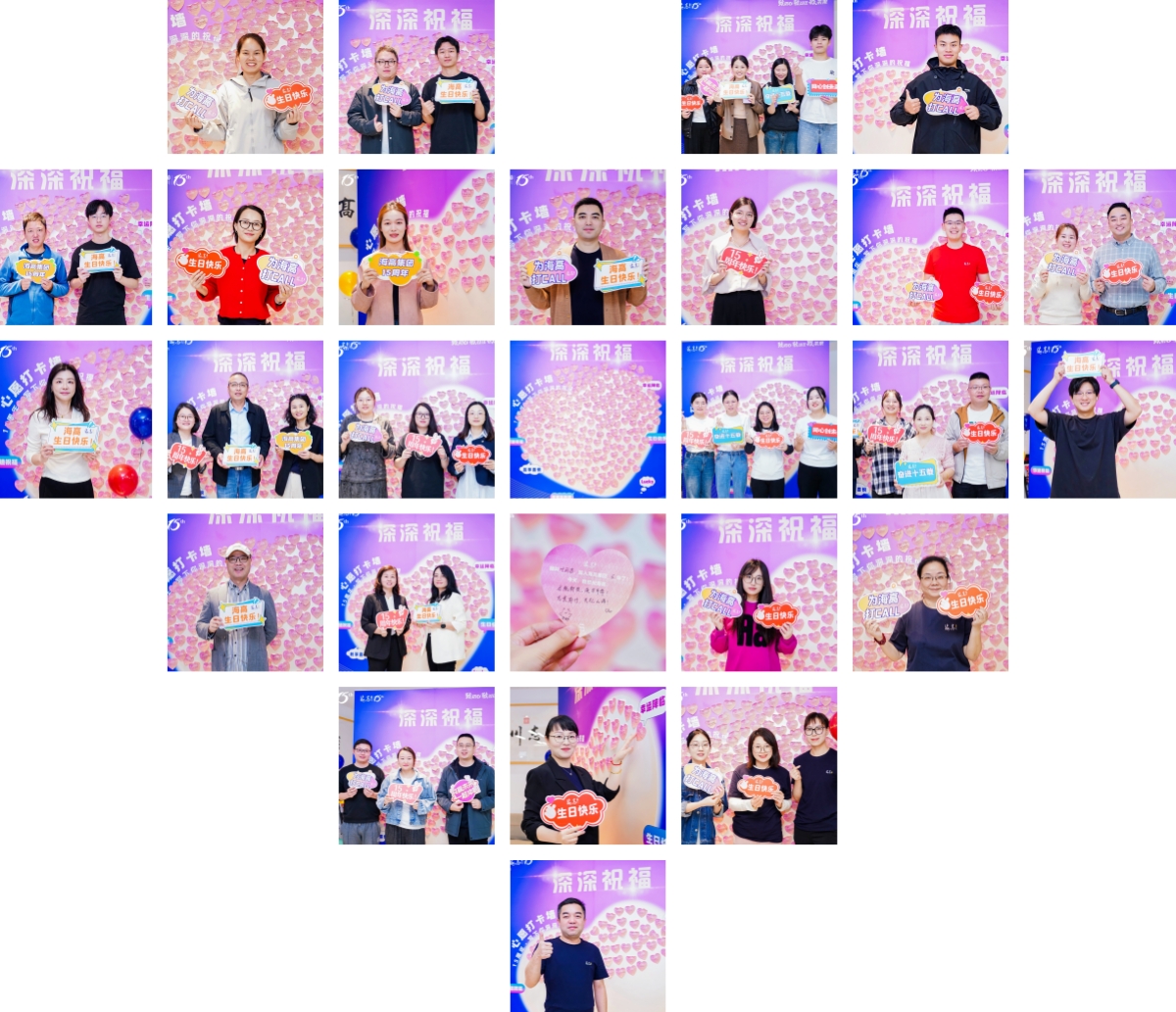 上午10时58分,生日会正式拉开帷幕,“深深祝福”墙靓丽登场。同事们纷纷在爱心便利贴上写下了对集团的美好祝福,将一颗颗小爱心拼凑成大爱心,最后汇聚出一片祝福与爱的海洋。祝福的同时,大家还将自己的姓名卡投入抽奖箱,期待着在随后的“幸运15”抽奖环节中收获惊喜。